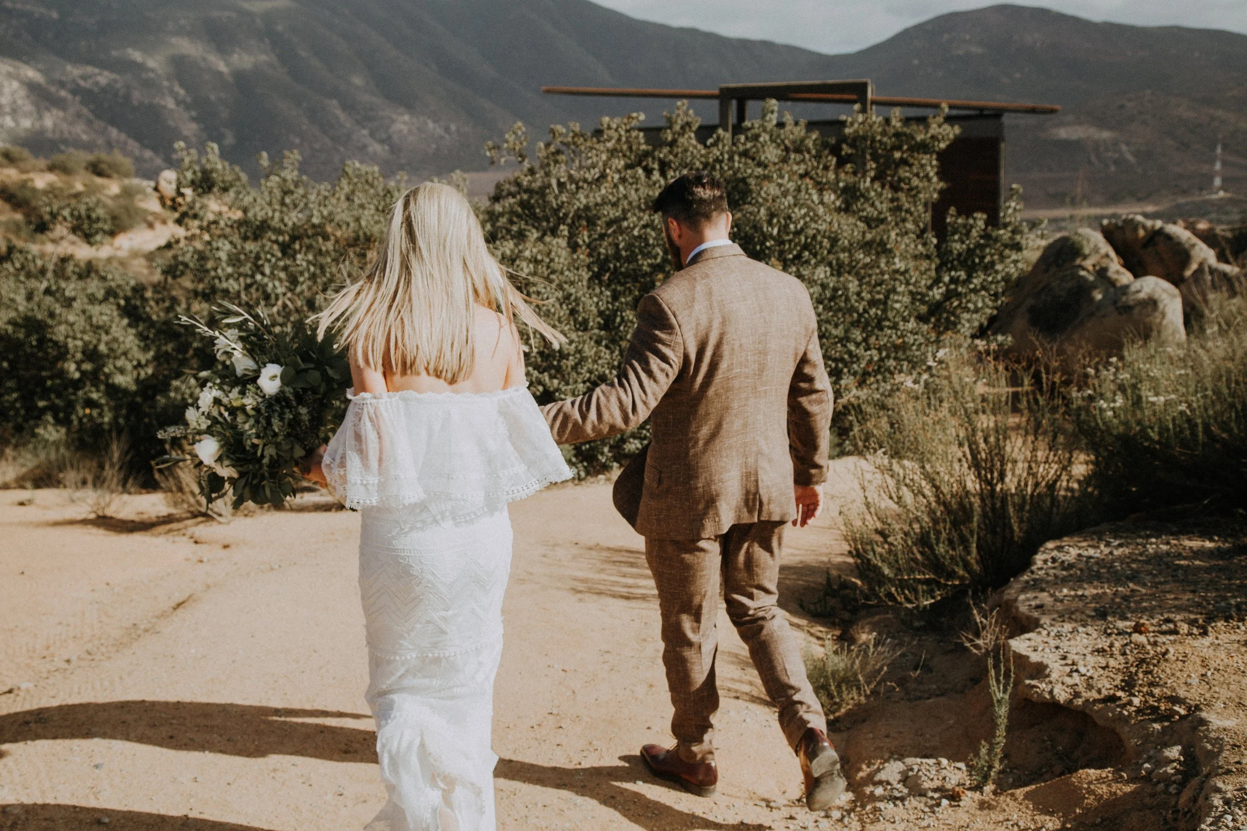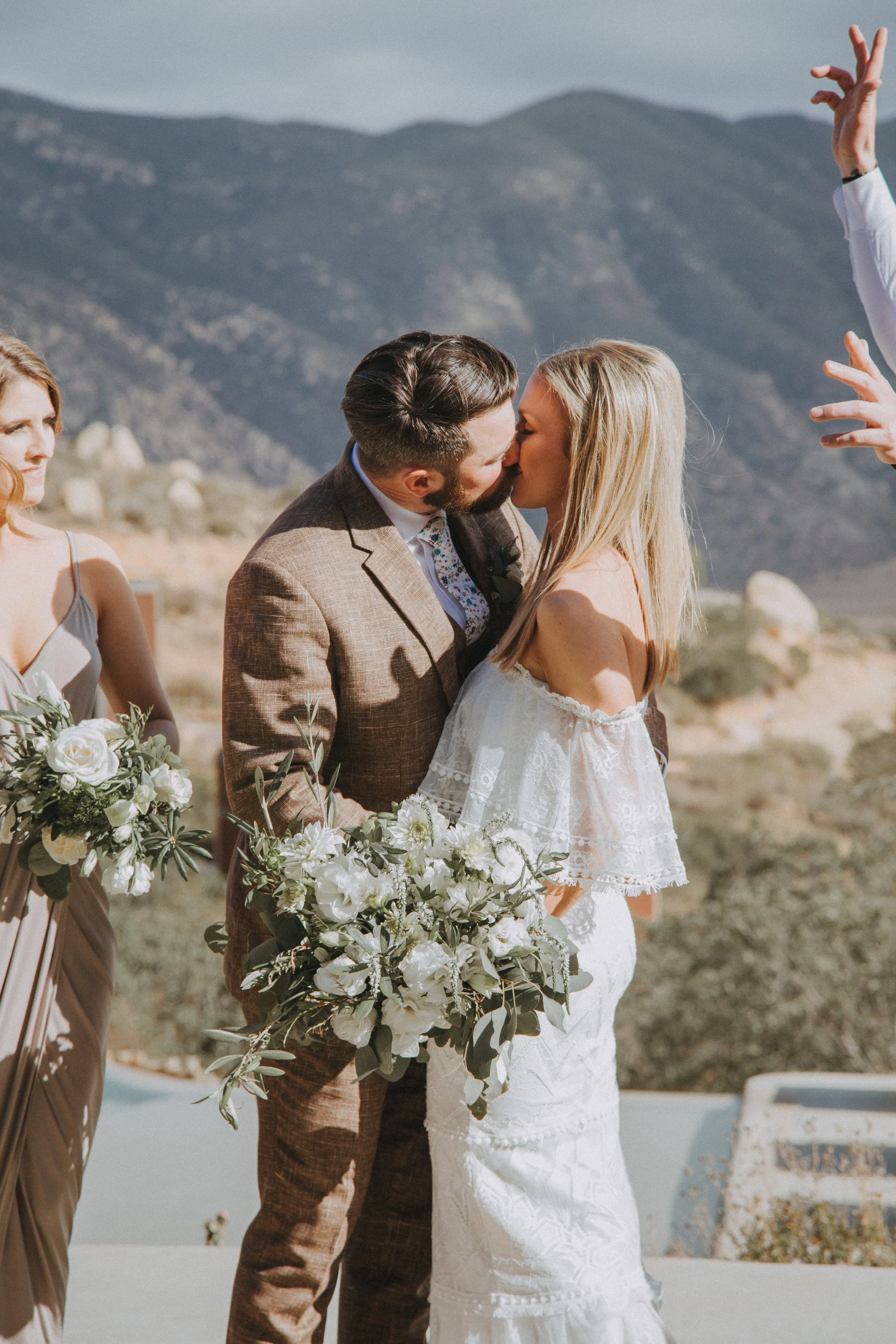 Chris & Dee’s wedding venue was in the gorgeous mountainous desert part of Mexico just south of California. I shot their beautiful wedding photos and videography at one of the most gorgeous venues I have seen at Encuentro Guadalupe. The rooms where the guests stayed were in glamorous pods all along the cliff side. How cool!! The bridal and groom attire matched the scenery perfectly with the off the shoulder lace dress and tweed brown vintage styled suit. This wedding was thoughtfully planned out and so uniquely serene.